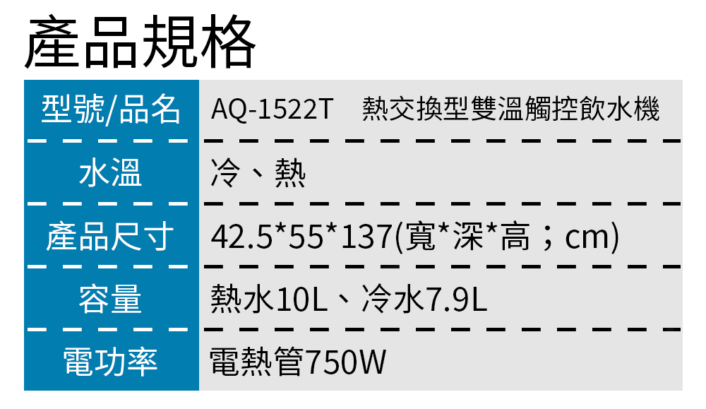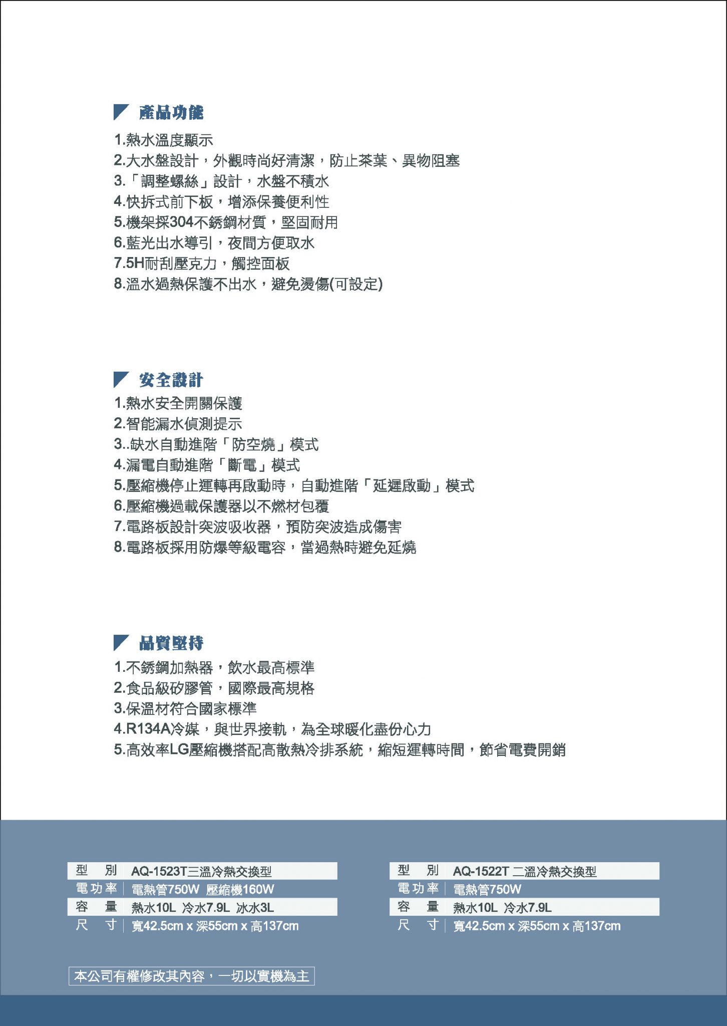 Aquatek沛宸 AQ-1522T 熱交換型-雙溫觸控式飲水機 -RO冷熱雙溫落地型