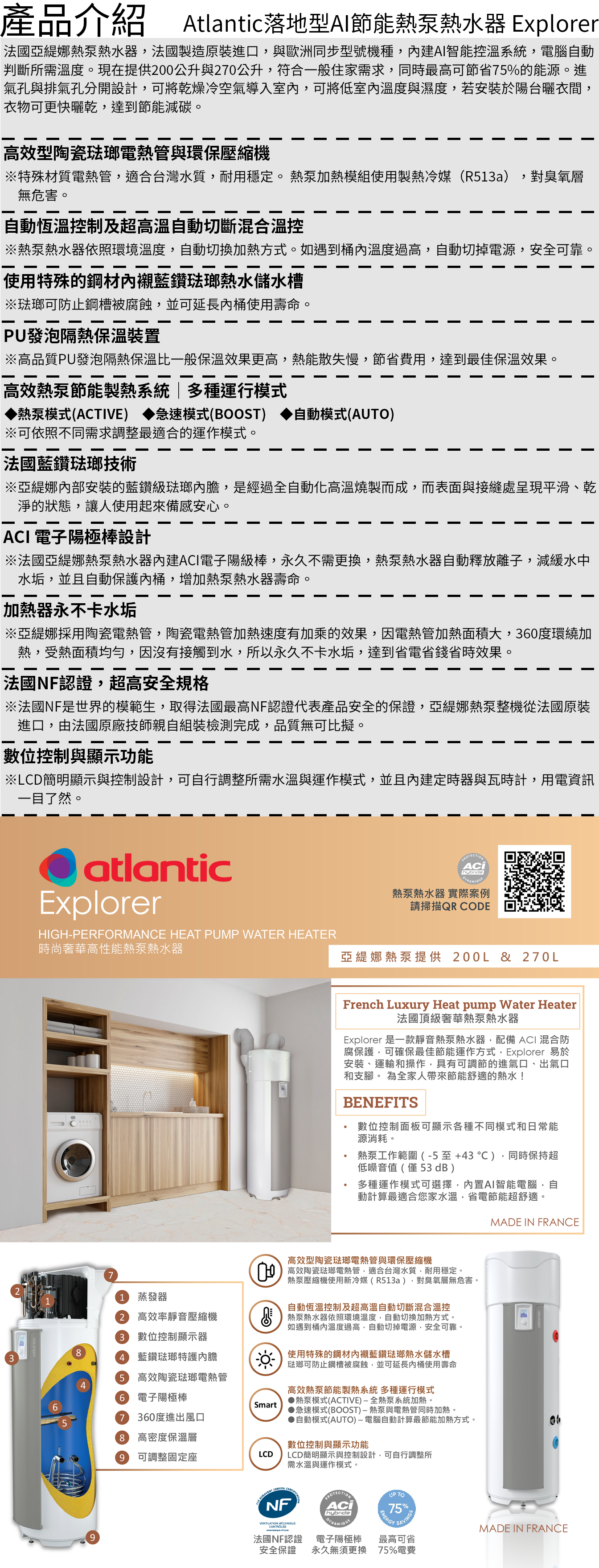 Atlantic法國亞緹娜 落地型AI節能熱泵熱水器 Explorer -循環式熱泵