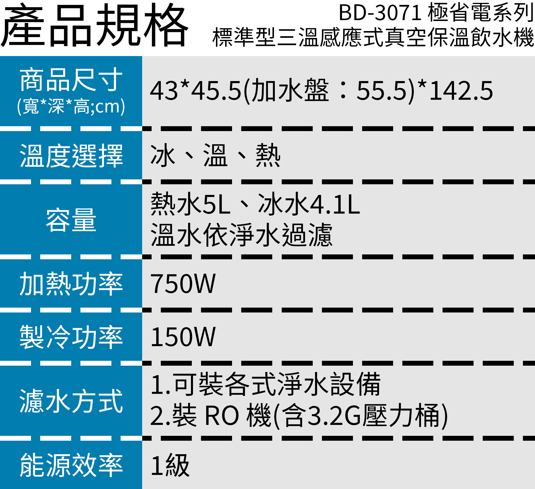 Buder 普德 BD-3071 極省電系列 標準型三溫感應式真空保溫飲水機 -冰冷熱三溫落地型