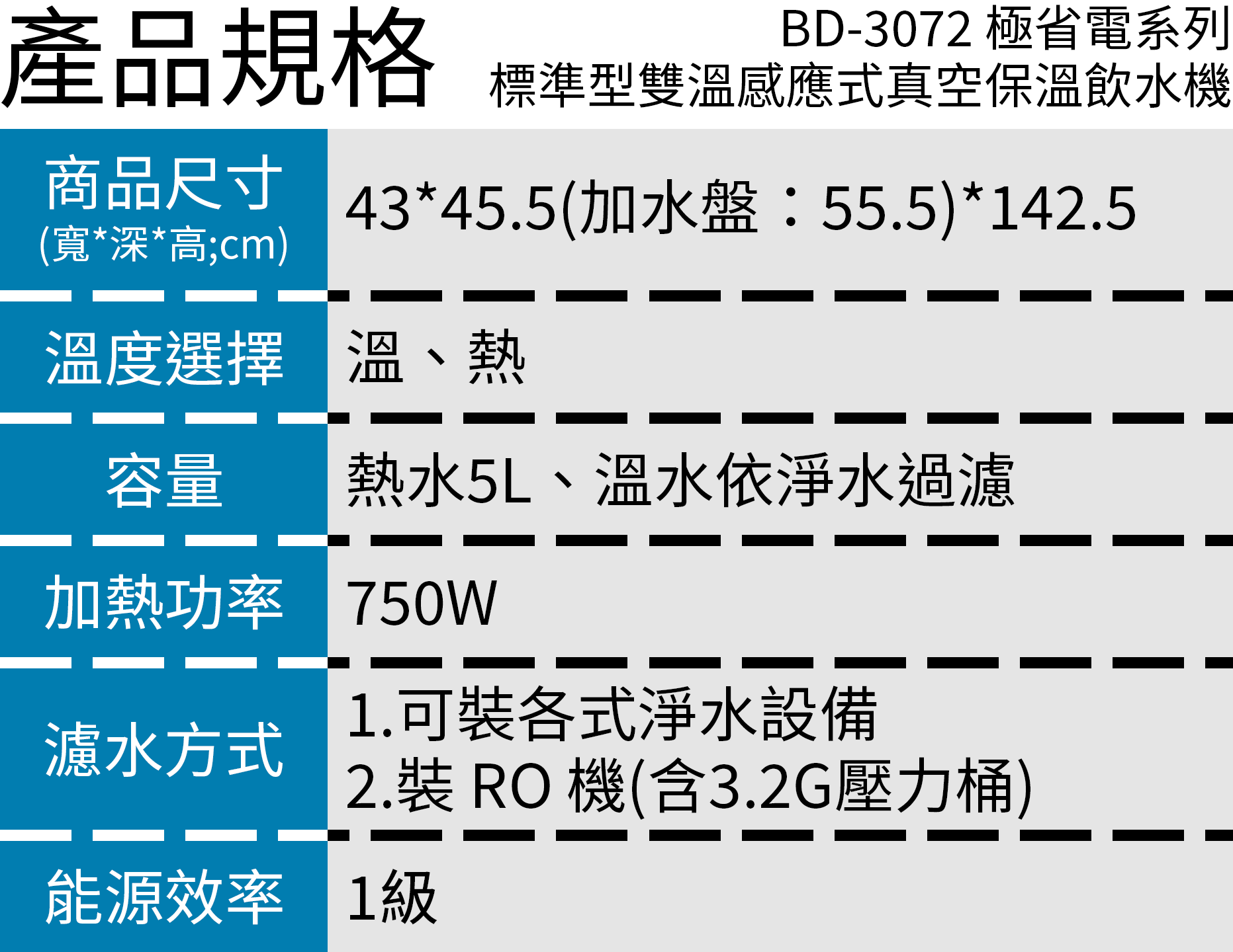 Buder 普德 BD-3072 極省電系列 標準型雙溫感應式真空保溫飲水機 -冰冷熱三溫落地型