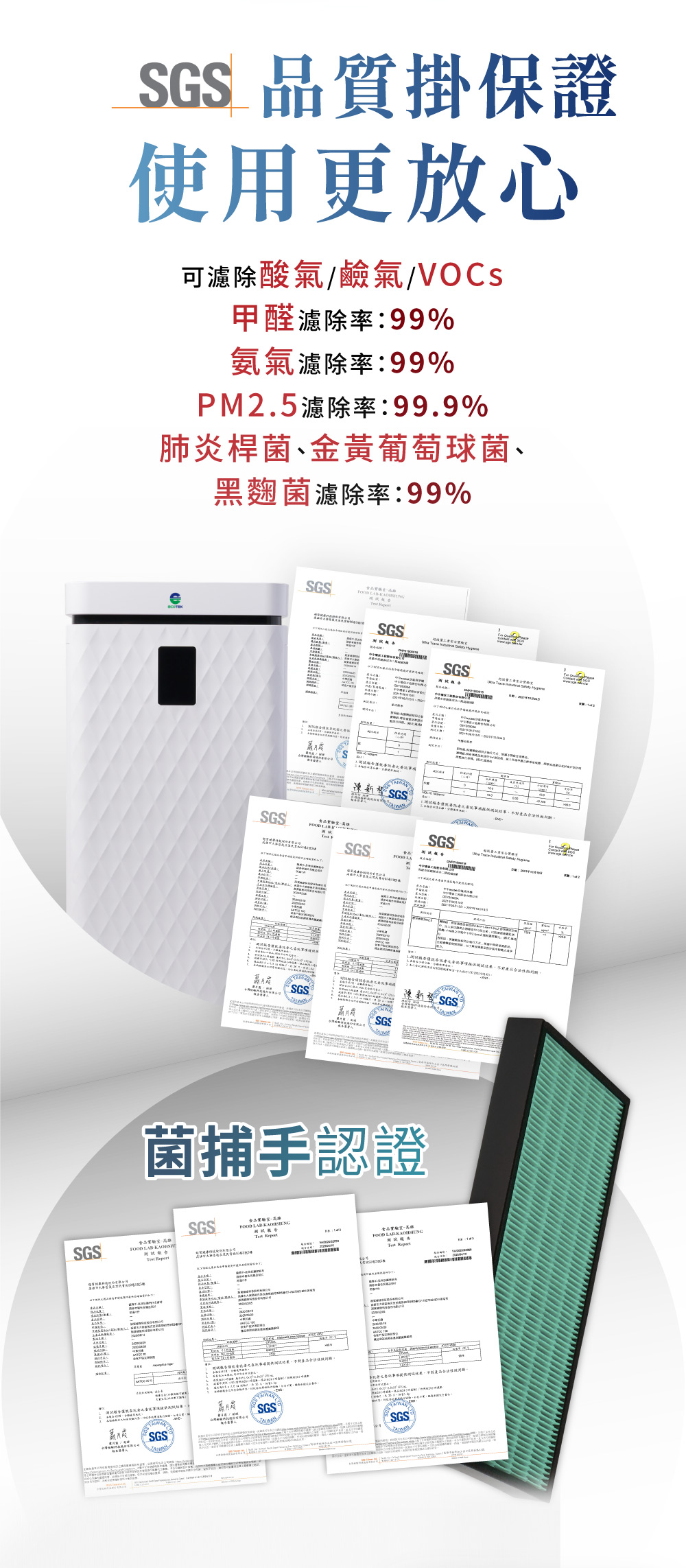 *HEPA濾網採用H12等級,空氣中0.3微米以上懸浮微粒皆可有效濾除