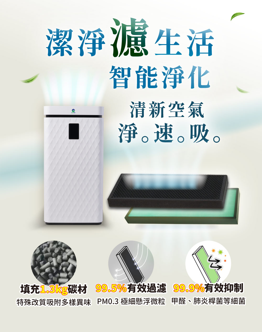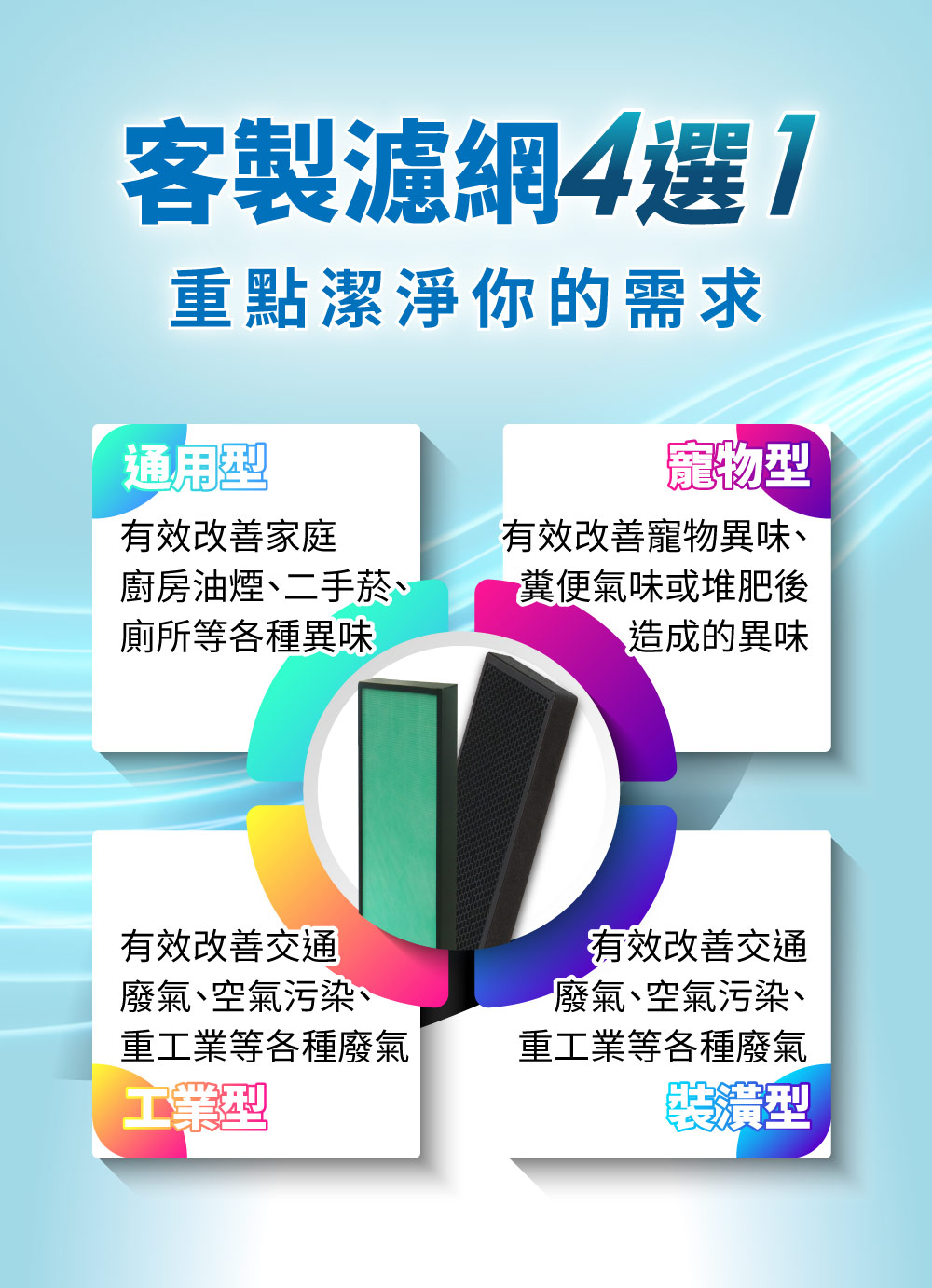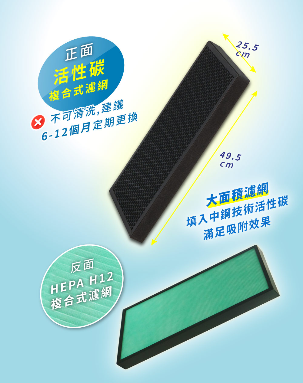 *每組濾網內含1.3kg高硬度活性碳材料,不僅可吸附甲醛、菸味、臭氣 更可吸附工業中酸 / 鹼性氣體