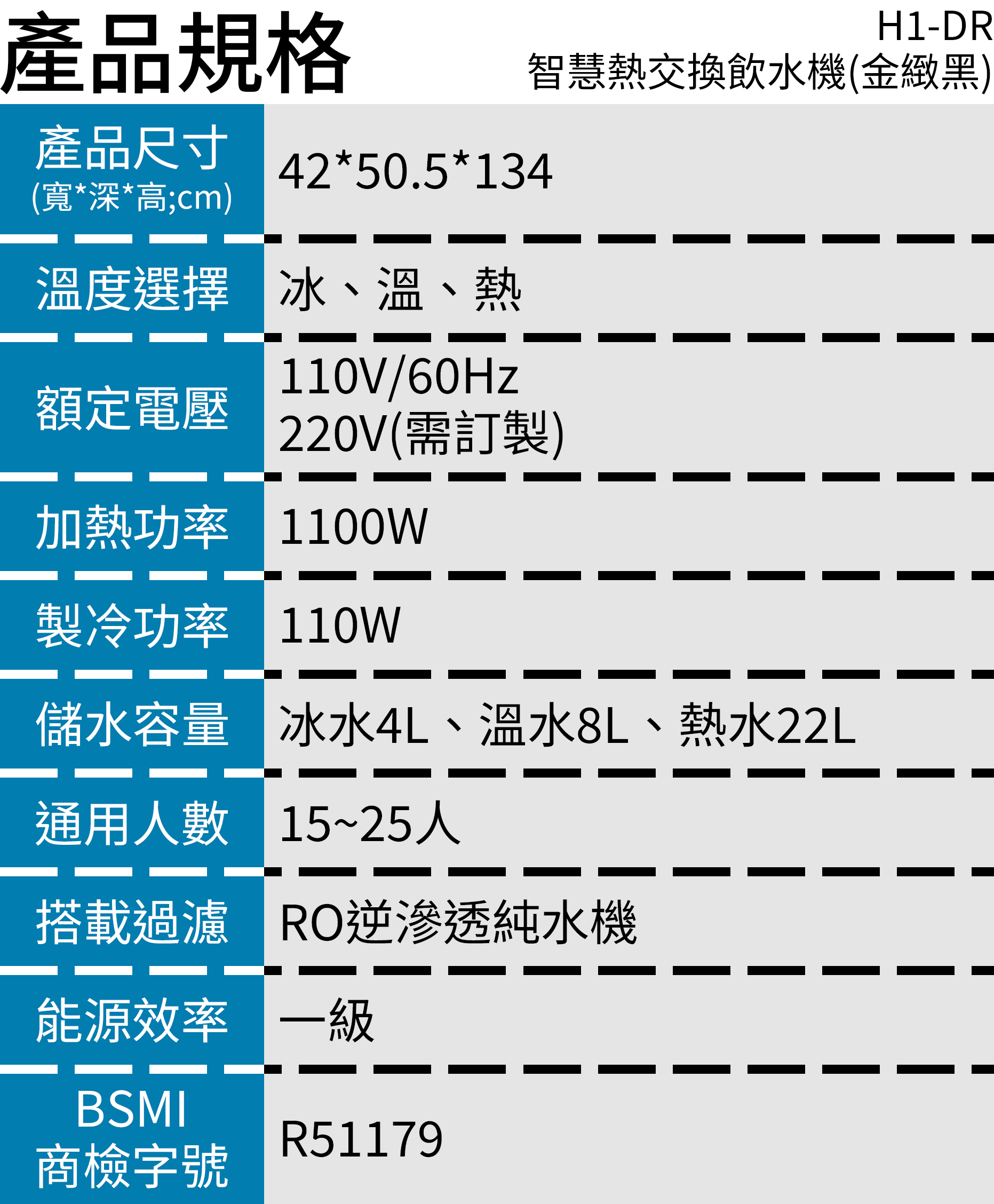 Haohsing豪星 H1-DR 智慧熱交換飲水機(金緻黑) -冰溫熱三溫落地型