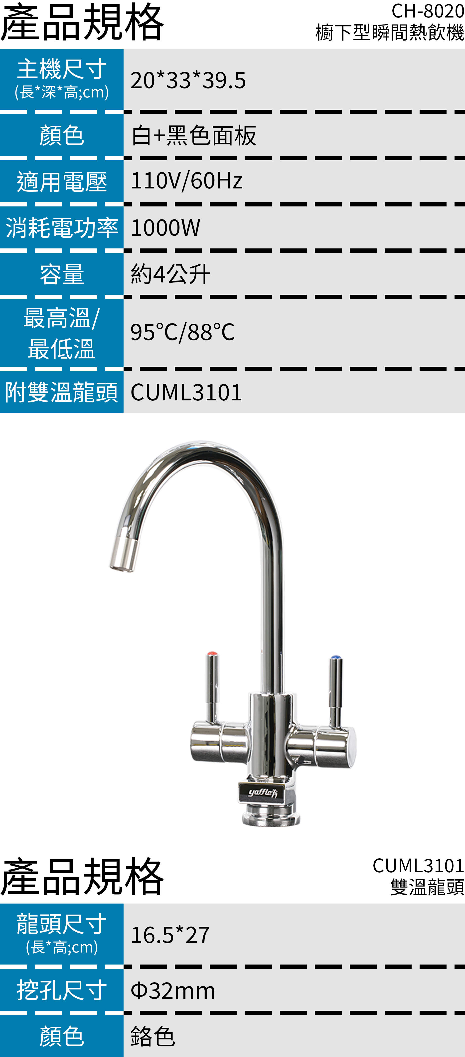 Yaffle亞爾浦 CH-8020 櫥下型瞬間熱飲機(搭配CUML3101B黑色雙溫龍頭)